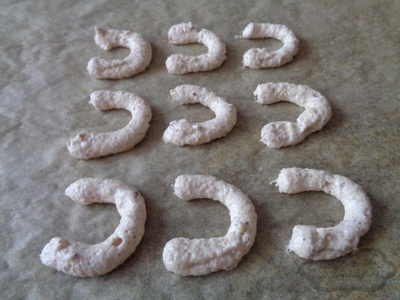 Zapneme troubu na 140°C. Nejprve tzv.vyoctujeme šlehací mísu a trochou octa polijeme i šlehací metly a pak ocet vylijeme. Bílky se budou díky tomu snáze šlehat. Ve vyoctované míse tedy vyšleháme bílky s cukrem v tuhý sníh. Pak přidáme ořechy a piškoty a zlehka zamícháme. S hmotou zbytečně nemanipulujeme, aby bílky nezřídly.