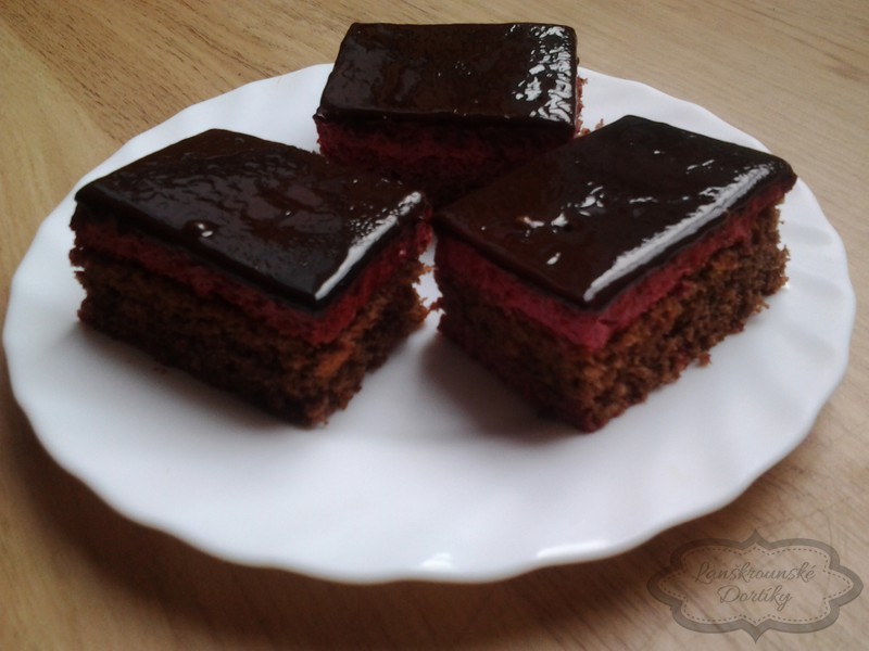 Moučník nakrájíme na jednotlivé řezy. Použila jsem netuhnoucí čokoládovou polevu - pokud použijete klasickou čokoládu, musíte ji nechat nejprve ztuhnout a pak teprve moučník rozkrájet.